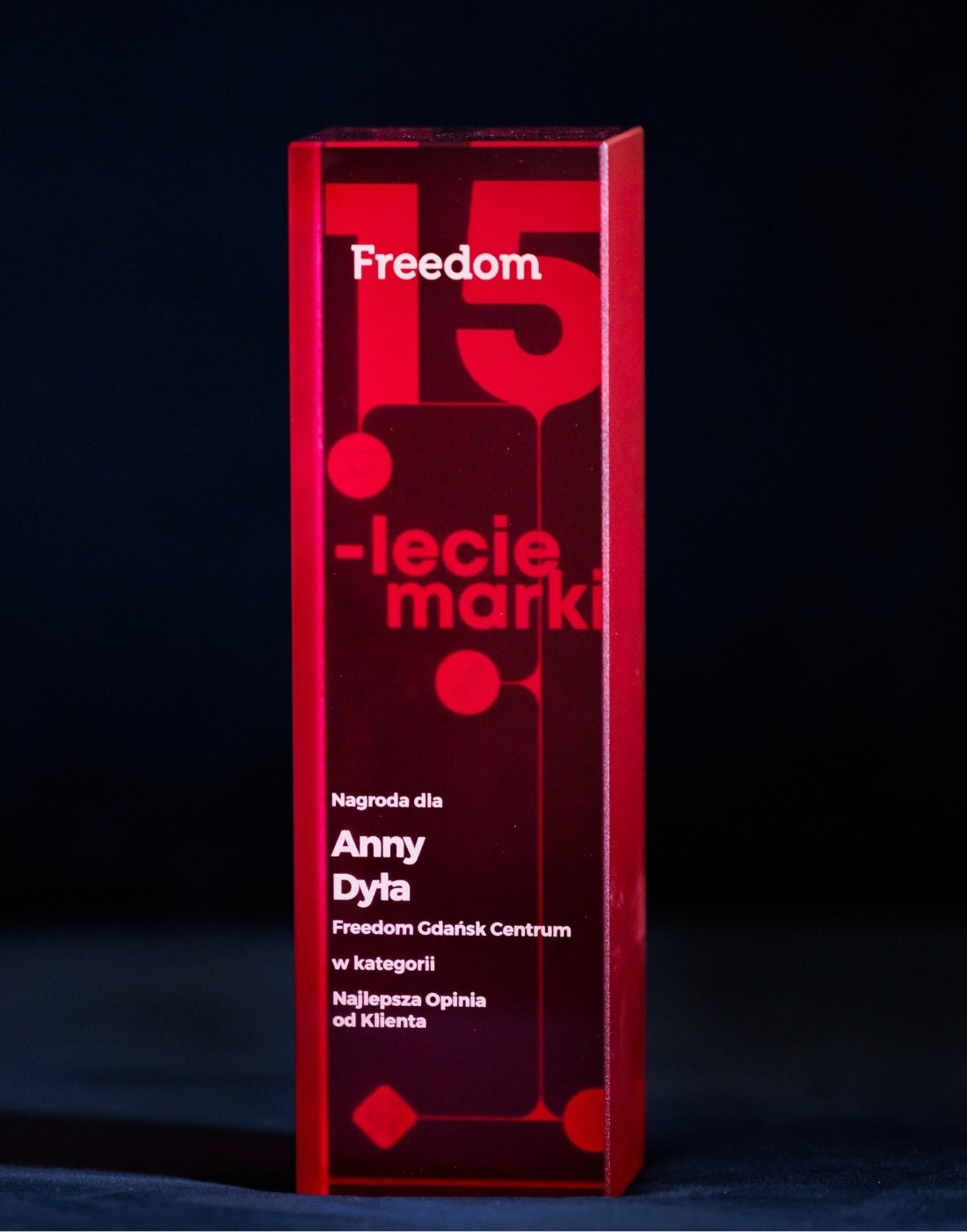 Podczas ogólnopolskiej gali z okazji 15-lecia Freedom Nieruchomości otrzymałam wyróżnienie w kategorii „Najlepsza Opinia od Klienta”, przyznane spośród ponad 700 agentów w całej Polsce.